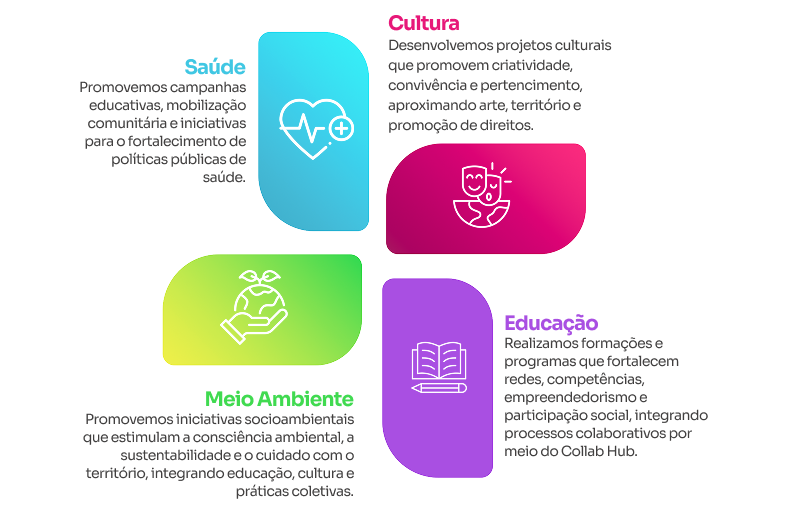 Realizamos formações e programas que fortalecem redes, competências, empreendedorismo e participação social, integrando processos colaborativos por meio do Collab Hub.